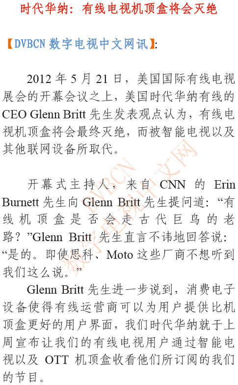 2012年5月21日,美国国际有线电视展会的开幕会议上,美国时代华纳有线的CEO Glenn Britt先生发表观点认为,有线电视机顶盒将会最终灭绝,而被智能电视以及其他联网设备所取代。