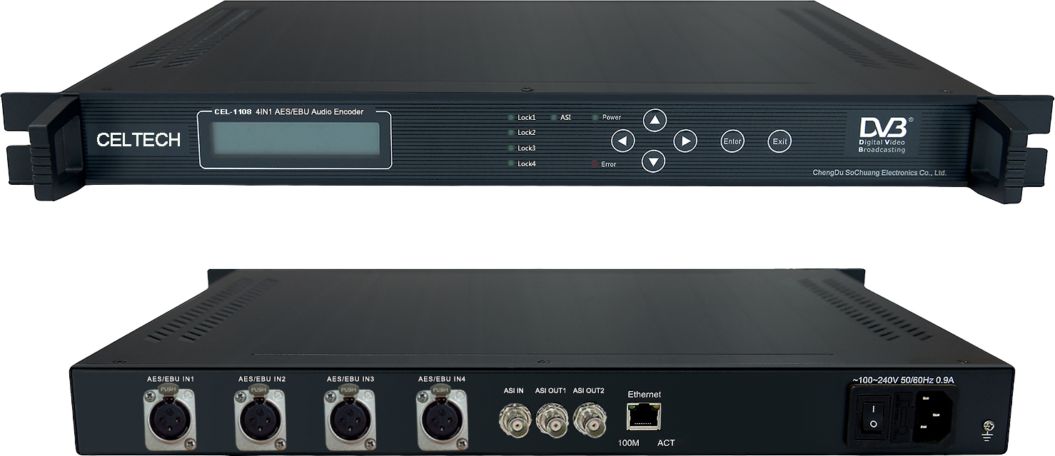 CEL-1108 AES/EBU四合一数字音频编码器支持4路数字音频(AES/EBU)输入和1路ASI输入,通过MPEG-1音频编码形成TS复用流,可再与1路ASI输入流进行复用生成1路多节目传输流,输出接口为ASI。数字音频编码器被广泛应用于数字广播系统中。