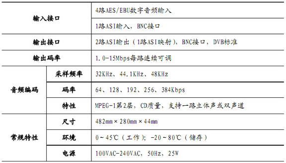 ·支持4路数字音频(AES/EBU)输入 ·输出码率连续可调,使用灵活方便 ·码流复用功能,支持节目号,PID编辑SDT插入,节目名和提供商编辑 ·支持中英文液晶显示,前面板按键操作和远程网管控制 ·高可靠性设计,运行稳定