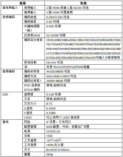 支持HTTP RTSP UDP RTMP ONVIF 等协议进行传输,支持1920x1200 1920x1080 1600x1200 1280x720 等分辨率,输入帧率支持:1~60帧每秒,HDMI/SDI高清信号通过编码压缩输出标准H.265/H.264的TS、HLS流,与主流云平台,百度云/乐视云/奥点云/腾讯云/Youtube无缝对接。 兼容接入大华、海康威视NVR产品并有声音。 产品采用国际主流编码芯片方案,广电级质量标准软硬件设计,支持7x24小时不间断运行。