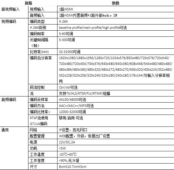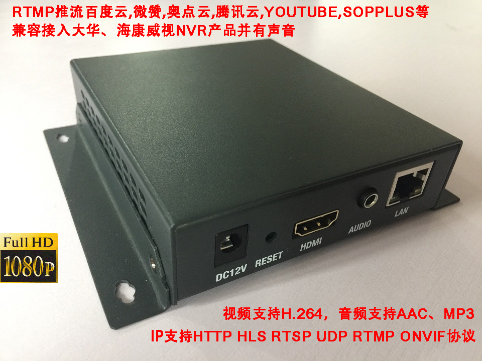 CEL-HEC402 H.264 HDMI音视频编码器是一款专业的高清音视频编码产品,该产品具有1路HDMI音视频输入接口和1路Audio IN输入接口,可对视频音频进行实时H.264/MPEG-4 AVC格式编码,并通过网口以HTTP RTSP UDP RTMP ONVIF等协议方式输出流媒体。全面支持VLC解码操作。支持1920x1200 1920x1080 1600x1200 1280x720 等HDMI分辨率,输入帧率支持:1~60帧每秒,HDMI高清信号通过编码压缩输出标准H.264 H264的TS、HLS流,与主流云平台,百度云/乐视云/奥点云/腾讯云/Youtube无缝对接。 支持外部Audio IN输入,与HDMI音频切换,二选一。 兼容接入大华、海康威视NVR产品并有声音。