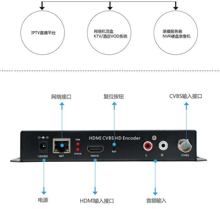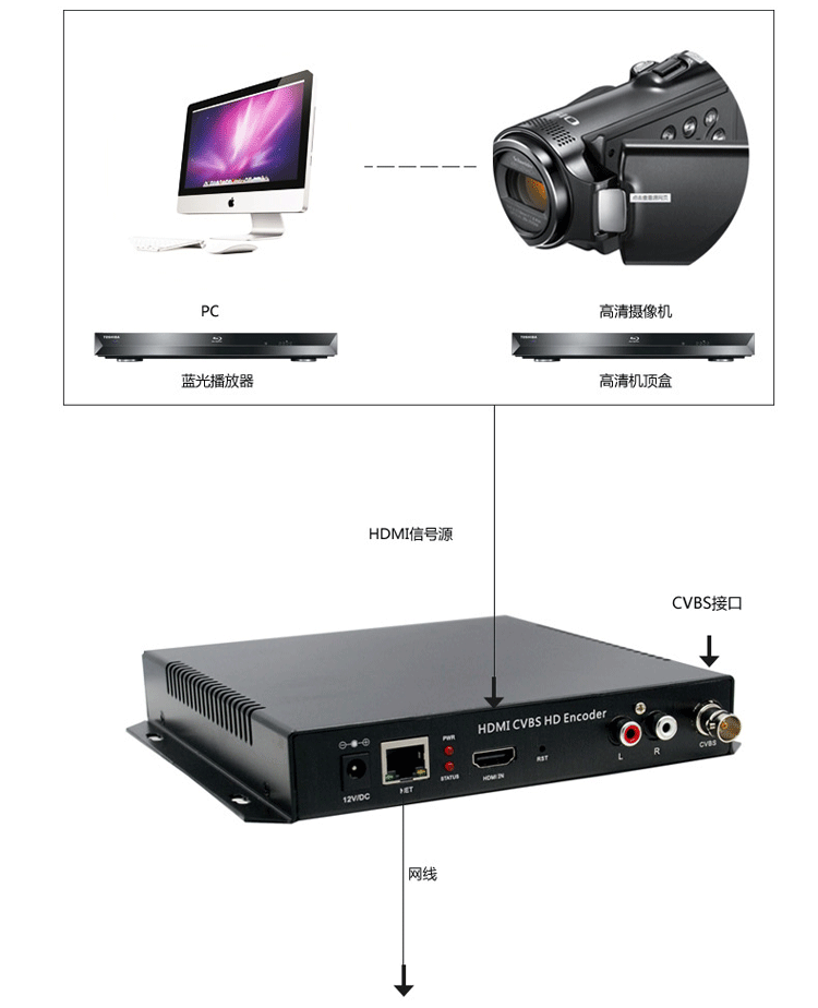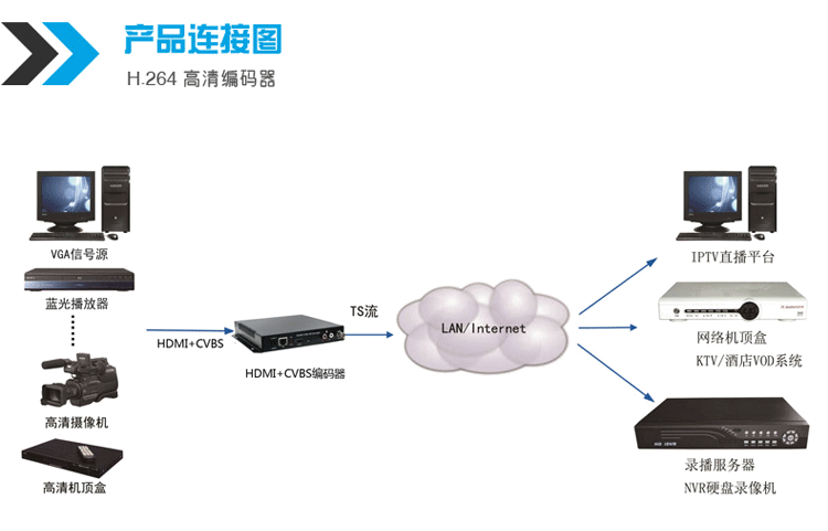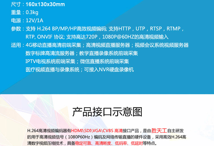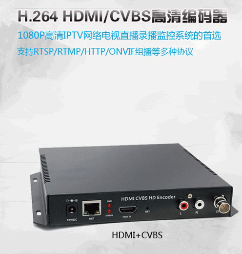 产品性能: ◆分辨率支持1920x1080/1280x720/1280x1024/1280x960/704x576 ◆支持HDMI输入,AV+AUDIO同时输入 ◆系统支持WINDOWS XP/VISTA/SERVER2003/SERVER2008/WIN7 32位及WIN764位、LINUX。 ◆支持一台电脑多个设备同时使用显示。 ◆支持直接网络直接连接无需配合高清采集卡使用。 ◆支持RTSP/RTP/HTTP/RTMP/UDP等协议。 ◆支持双码流.(主码流、副码流) ◆编码规范BASELINE PROFILE / MAIN PROFILE/ HIGH PROFILE,音频MP3,AAC ◆码率控制CBR/VBR 16KBIT/S~12MBIT/S ◆WEB控制界面 ◆功耗<6W,低功耗设计