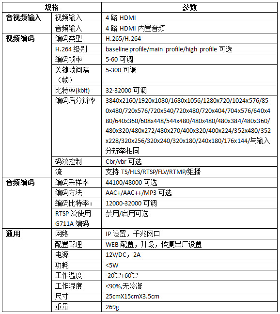 CEL-HEC541 H.265/H.264 4路HDMI音视频编码器是我司一款专业的高清音视频编码产品,该产品包括4路HDMI音视频输入,另外增加2路独立音频输入,可与2路HDMI音频混音。可对视频音频进行实时H.265/H.264/MPEG-4 AVC格式编码,并通过网口以HTTP、HLS、RTSP、UDP、RTMP、ONVIF等协议方式输出流媒体。全面支持VLC解码操作。支持3840x2160 1920x1200 1920x1080 1600x1200 1280x720等分辨率,输入帧率支持:1~60帧每秒,HDMI高清信号通过编码压缩输出标准H.264 H264的TS、HLS流,与主流云平台,百度云/乐视云/奥点云/腾讯云/微赞/Youtube等无缝对接。