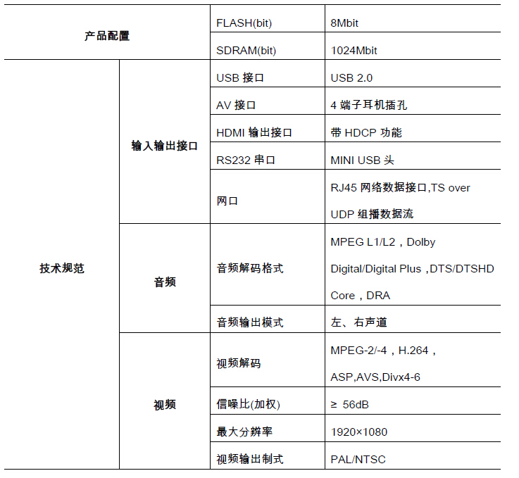 解码MPEG2, H.264高清UDP组播流媒体,用于收看局域网内的电视直播,支持播放USB优盘,移动硬盘的电影,音乐,图片等,支持多种音视频格式,如MPEG-2,H.264,RMVB,杜比AC3,AAC,MP3,MPEG layer-1等。