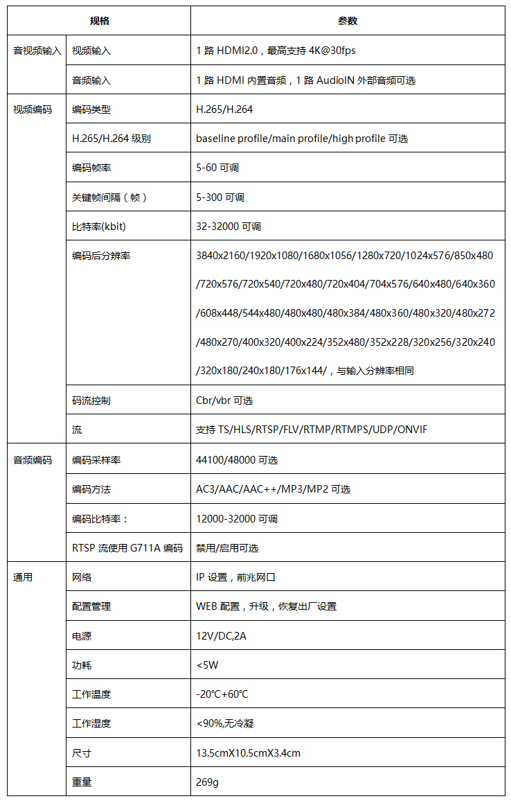 CEL-HECK501,是我司一款专业的H.265/H.264 4K HDMI超高清网络编码器,该产品支持HTTP、RTSP、UDP、RTMP/RTMPS、ONVIF等网络协议进行传输,支持3840x2160、1920x1200、1920x1080、1600x1200、1280x720等HDMI分辨率,编码帧率支持: 1~60帧每秒,HDMI高清信号通过编码压缩输出标准H.265/H.264的TS、HLS流,与主流云平台,百度云、乐视云、奥点云、腾讯云、目睹、微赞、Youtube、Facebook、SopPlus等无缝对接,也可以与海康、大华、宇视等NVR配合使用。