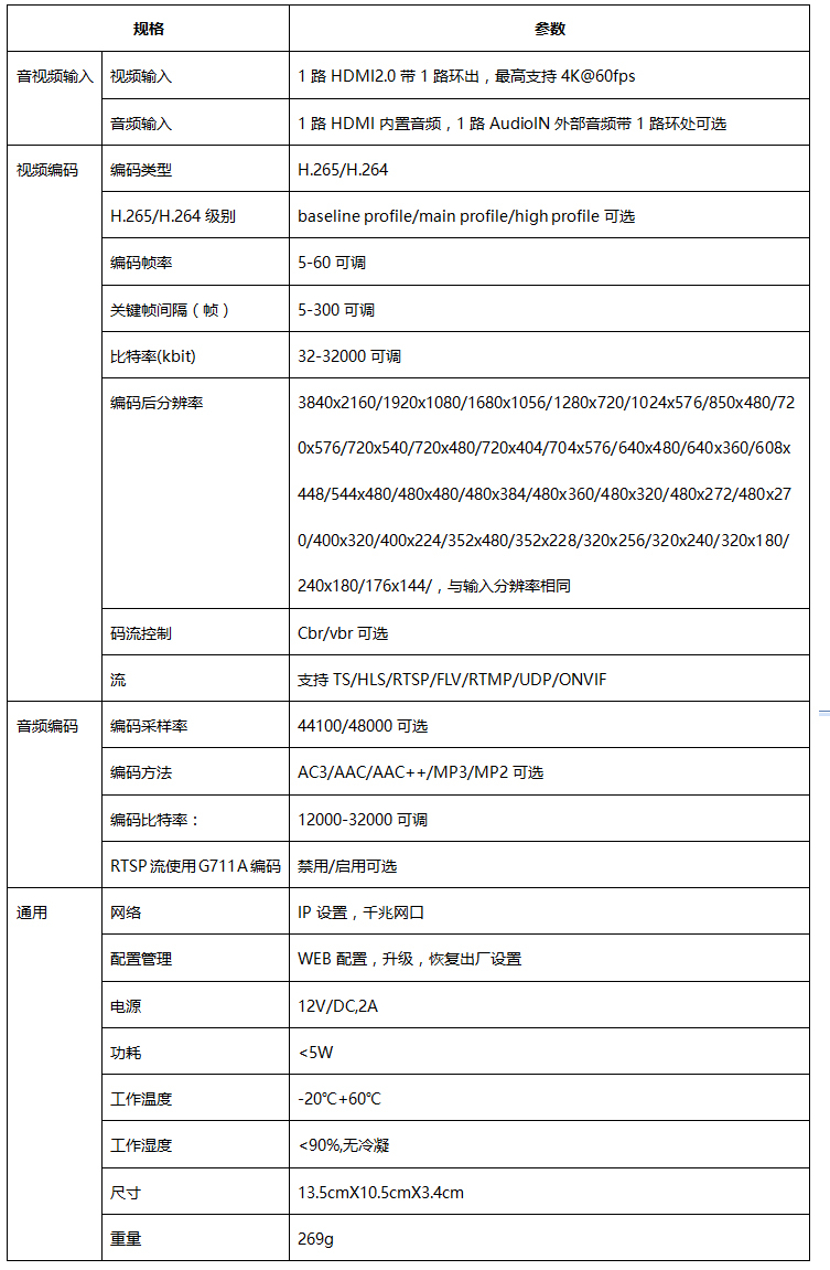 ·H.265/H.264超高清编码 ·支持 4K SMPTE 4096x2160@60 输入的和编码 ·支持 4K 3840x2160@60 输入的和编码 ·支持 2K 2560x1440@144 输入和编码,编码也是144帧 ·支持 BT2020 色域 ·支持 HDR10, 10bit 输入和编码,要完整支持10bit,请保证HDMI输入是10bit方式输入,同时选择H.265 Main10 Profile编码 ·支持 100M 比特率编码 ·支持 音频视频环出,过主芯片方式 ·多协议支持(HTTP、RTSP、UDP、RTMP/RTMPS、ONVIF); ·ONVIF支持大华海康NVR ·除了HDMI的音频编码,还支持独立外部音频输入,实现HDMI内置视频+内置音频;HDMI内置视频+外部音频;HDMI内置视频+内置音频+外置音频,三种选择。 ·支持 NTFS/EXFAT/FAT32 格式的USB3.0 U盘/SD卡 一键录像,内置SAMBA服务器,可以通过网上邻居查看录像。 ·12V供电,低功耗; ·尺寸小,156x104x35mm,便于携带; ·低延时,200ms左右。