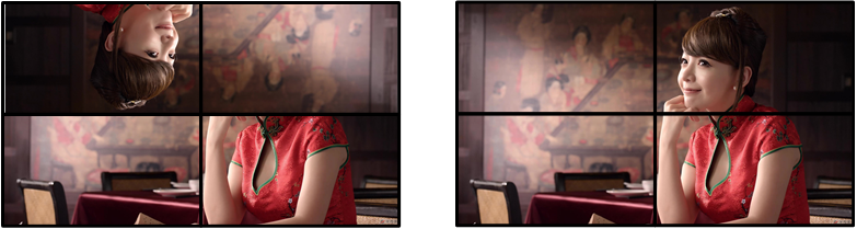 5、图像旋转功能 与普通拼接产品相比,CEL-UD22具有针对组信号进行180度翻转功能。用户在使用普通液晶电视拼接时,对上一排液晶电视翻转180度,从而大幅度降低液晶拼接缝隙,减少图像因边缝过大引起的失真,如下图所示: