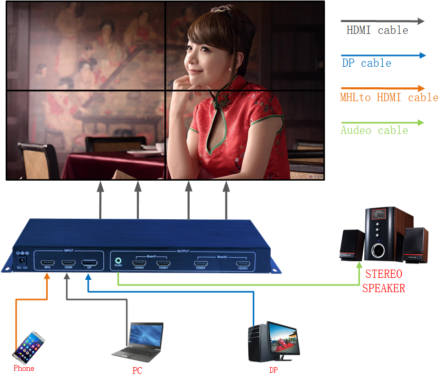 2、输出信号 支持4路HDMI 1.3信号输出,输出分辨率1920x1080@60HZ。