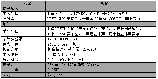 三、主要功能 1、输入信号 ﹡支持1路HDMI2.0、1路HDMI1.4同时兼容MHL信号、1路DP1.2信号输入。 ﹡ HDMI2.0端口最高可以支持3840x2160@60HZ的分辨率和刷新率的HDMI信号输入; ﹡ HDMI1.4最高可以兼容3840x2160@30HZ的HDMI信号输入,同时通过普通转拼线也可以同时兼容MHL信号的输入; ﹡ 同时支持1路DP1.2信号输入,最高分辨率可达3840x2160@60HZ;