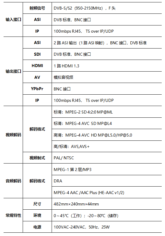 概述 新一代专业高标清大卡接收解码器,可解码H.264/MPEG4 AVC、MPEG2,AVS/AVS+,支持1路DVB(DVBC+DVBS/S2+DVBT/T2可选)射频信号,1路ASI输入或1路IP输入,输入DVB信号DVB被解调成TS流,并通过ASI接口,AV接口,YPbPr接口,SDI接口,HDMI接口或IP口输出,接口齐全丰富。它有2个CI接口,同时支持2路CAM卡套解密,拥有强大的信号接收、解扰以及解码功能,满足多种应用需求。是数字电视前端系统中接收和处理加密卫星节目的主要设备之一。 特点 支持解码AVS,AVS+ 支持DVBC+DVBS/S2+DVBT/T2、ASI、IP接口输入 支持2路CI接口的多节目解扰处理 支持ASI、AV、YPbPr、SDI、HDMI 和IP输出 支持输入、输出信号的实时监测 支持中英文液晶显示,前面板按键操作和远程网管控制 高可靠性设计,运行稳定 技术指标