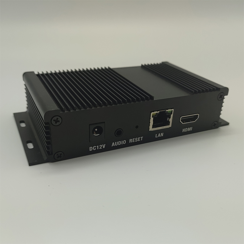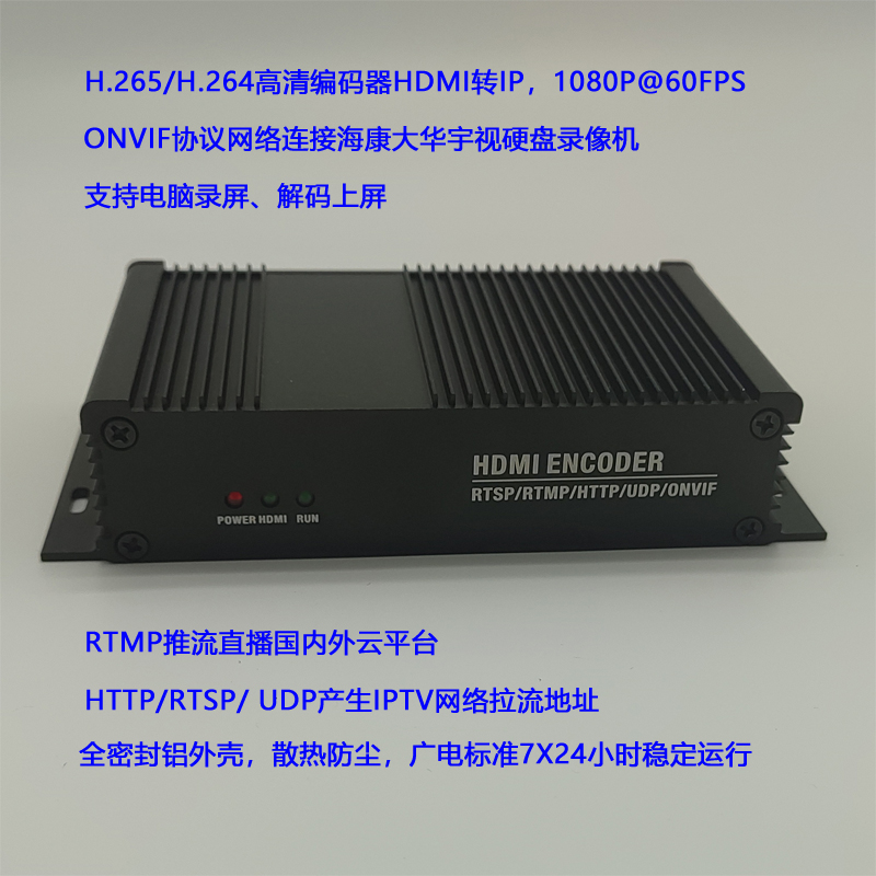 H.265/H.264高清编码器,实现HDMI转IP HDMI高清信号通过编码压缩输出国际标准H.265和H.264格式视频,音频AAC,G.7111等。 1080P@60fps,输入输出分辨率最高支持1080P(1920x1080, 1280x720, 720x576),帧率最高支持60帧每秒。 一个主码流,一个副码流,均可独立配置。 支持外部Audio IN输入,与HDMI音频切换,二选一。 ONVIF 协议网络连接大华、海康、宇视硬盘录像机或者解码器、解码矩阵。 RTMP推流直播,支持大部分云平台,微赞、阿里云、奥点云、七牛云、目睹、腾讯云、淘宝、斗鱼、虎牙、B站、抖音、快手、Youtube、Facebook、WOWZA、Twitch、SopPlus等。 HTTP/RTSP/UDP产生IPTV网络拉流地址,可实现会议直播、对接广电设备、视频会议、远程医疗等。 网页控制方式。 可任意配置网络IP。 产品尺寸:143*73*31mm 中英文界面